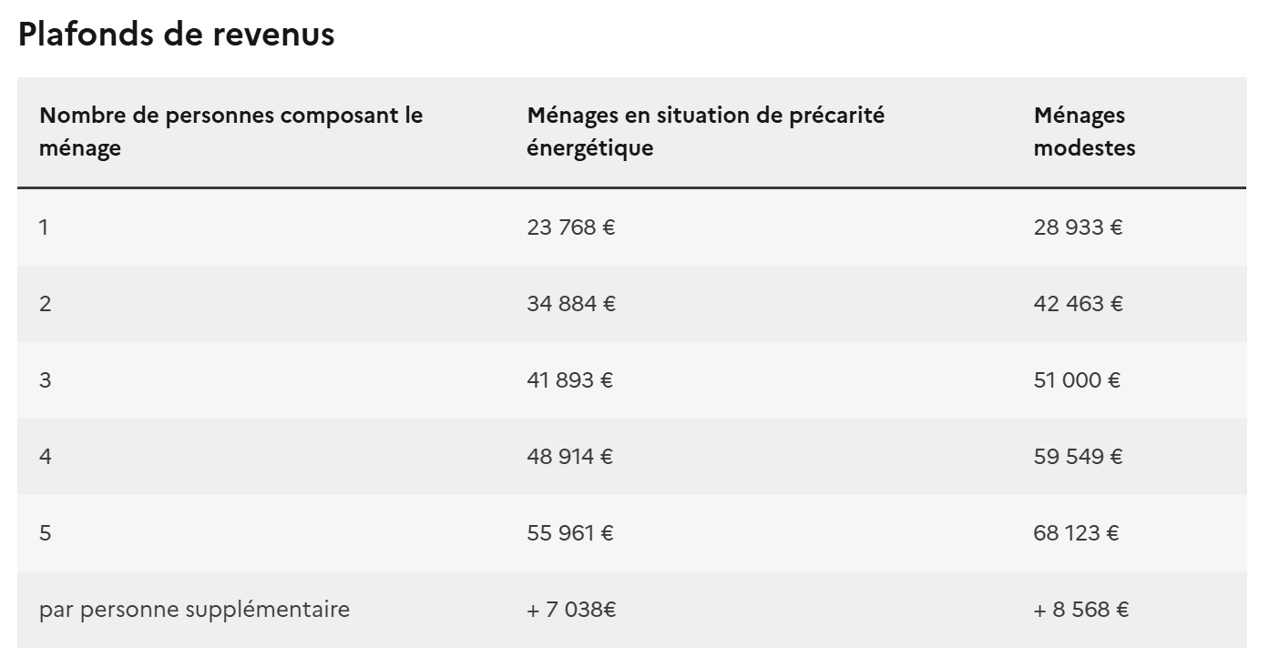 4 200 € pour les ménages modestes et les ménages en situation de précarité énergétique (dont les revenus ne dépassent pas les plafonds indiqués dans le tableau ci-dessous)